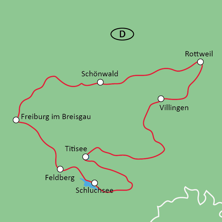 Ihre Radtour durch den Südschwarzwald beginnt auf ruhigen Wegen zwischen offenen Landschaften und stillen Wäldern. Nur wenige Dörfer säumen die Strecke. Ein Abstecher zur Quelle der Brigach lohnt sich – sie bildet gemeinsam mit der Breg in Donaueschingen die junge Donau. Tagesziel ist der heilklimatische Kurort Schönwald, bekannt als Geburtsort der Schwarzwälder Kuckucksuhr.