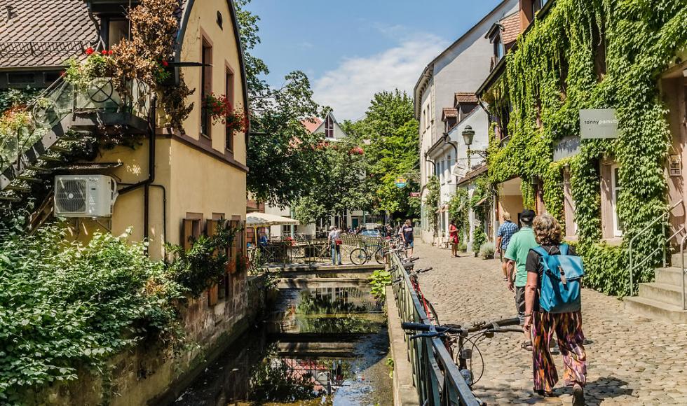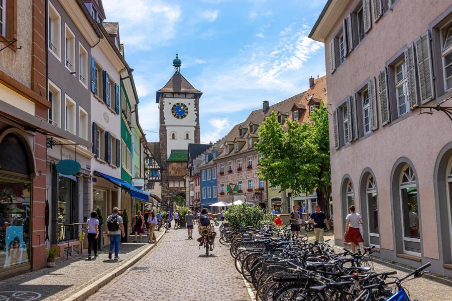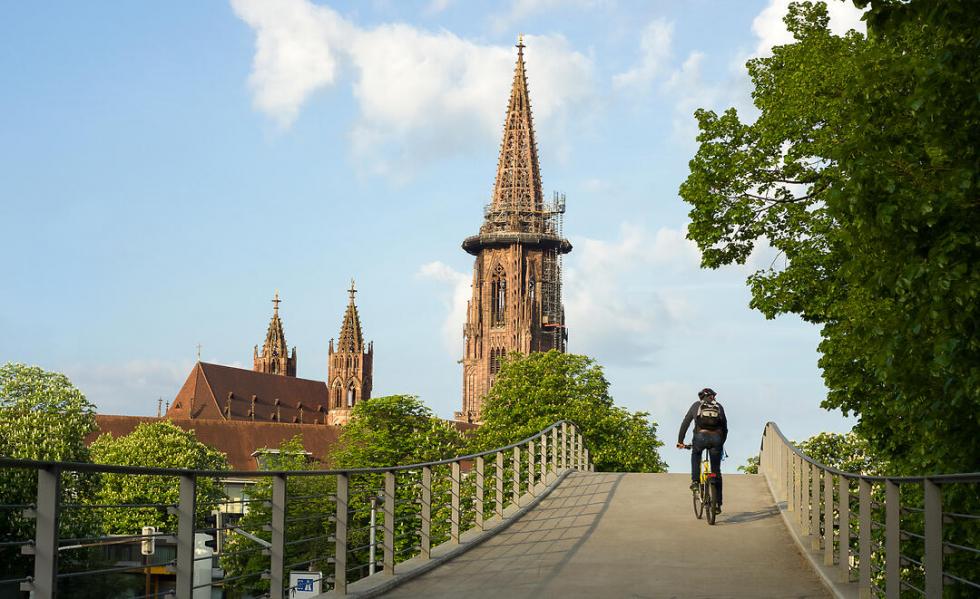 Bevor es losgeht, lohnt ein Blick auf die Adlerschanzen, Trainingsort der Nachwuchsskispringer. Danach radeln Sie über zwei sanfte Steigungen zur Bregquelle und genießen eine lange Abfahrt ins Simonswälder Tal. Entlang von Gutach und Elz erreichen Sie Freiburg, die sonnigste Großstadt Deutschlands. Erkunden Sie die Altstadt mit ihren „Gässle und Bächle“ sowie das lebendige Flair der Universitätsstadt.