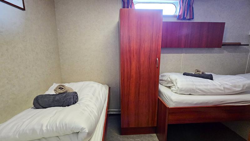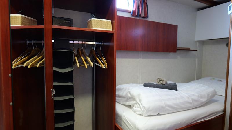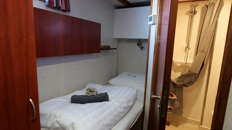 Alle Kabinen verfügen über ein Badezimmer mit Dusche, Toilette und Waschbecken, ein Fenster (die beiden Kabinen mit Doppelbett haben ein etwas größeres Fenster, das sich zudem öffnen lässt) und individuell regulierbarer Klimaanlage.