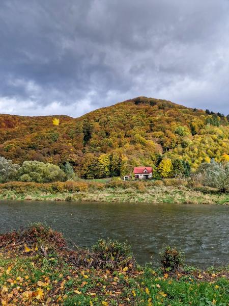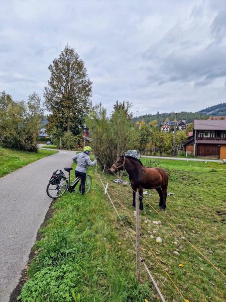 Nachdem wir die Stadt Nowy Targ verlassen hatten, folgten wir dem Fluss Dunajec auf einem asphaltierten Radweg nach Debro. Die Radwege in Polen waren in ausgezeichnetem Zustand. Obwohl wir nicht viel Sonnenschein hatten, war das Wetter schön. Die Häuser waren größtenteils neu und aus Holz gebaut. Wir kamen sogar an einer Holzkirche vorbei. Unterwegs begrüßten uns Pferde, Ziegen, Schafe und Truthähne. Die Einheimischen, die uns begegneten, begrüßten uns mit „Dzien Dobry”, und ich lernte, dies ebenfalls zu sagen.