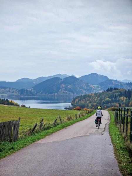 Der Shuttlebus wartete bereits auf uns und Maciej brachte uns in eine kleine Stadt namens Chochołow. Dort gibt es traditionelle Holzhäuser, die den Ort zu etwas Besonderem machen. Dann war es Zeit für eine Pause. Wir machten Halt in einem traditionellen Blockhaus-Restaurant. Dort kann man traditionellen gebackenen Käse bestellen. Ich bestellte ein komplettes Gulaschgericht und hatte das Gefühl, dass es genau das Richtige für meine Seele war. Es war Zeit, mit dem Radfahren zu beginnen, aber nach dem Essen hatte ich das vergessen und schnallte mich für eine weitere Fahrt im Shuttle an. Zum Glück erinnerte mich Maciej daran. Der Weg begann in Chochołow und führte auf einen ausgezeichneten, asphaltierten, flachen Radweg, der früher eine Eisenbahnstrecke war. Die Felder waren klein und viele davon waren mit Schafen und Kühen beweidet. Die Tatra-Berge bildeten die Kulisse entlang unseres Weges. Als wir uns der Stadt Nowy Targ näherten, war ein Teil des Weges neu gebaut und noch unbefestigt. Wir kamen in unserem Hotel an, ruhten uns zuerst aus und nahmen dann einen kleinen Snack zu uns. Der Gesamteindruck von Nowy Targ ist, dass es zwar eine kleine Stadt ist, es aber viele junge und alte Menschen und viele Geschäfte gibt, was sie zu einer dynamischen Stadt macht, die wirtschaftlich zu florieren scheint (ich bin kein Experte auf diesem Gebiet).