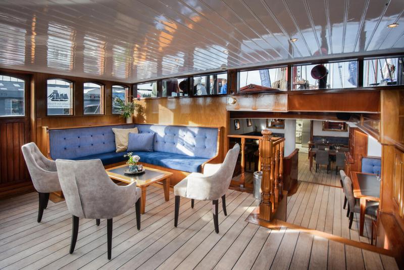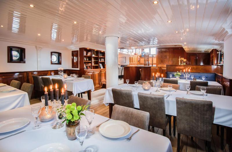 Das schöne Schiff verfügt über eine gehobene Inneneinrichtung und ein im nautischen Stil gehaltenes Restaurant, wo die Mahlzeiten eingenommen werden. Die urige Schiffsbar ist gut sortiert. Das Steuerhaus hat eine schöne Sitzecke. Hier und an Deck haben Sie den besten Ausblick übers Wasser. WLAN steht an Bord zur Verfügung.