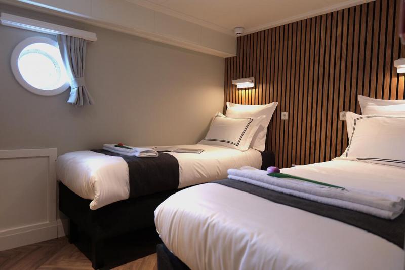 Alle liebevoll eingerichteten Kabinen befinden sich auf dem Unterdeck und verfügen über ein eigenes Bad mit Dusche, Waschbecken und WC sowie eine individuell regulierte Klimaanlage, Mini-Safe und Haartrockner; die Fenster lassen sich aus Sicherheitsgründen nicht öffnen.