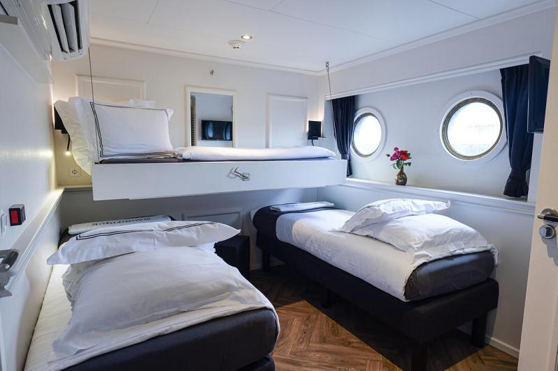 - Oberdeck: 4 Suiten (ca. 14m²), 2 Einzelbetten (teilweise auch als Doppelbett buchbar), kleiner Sitzecke und großem Panoramafenster, das zur Hälfte geöffnet werden kann.