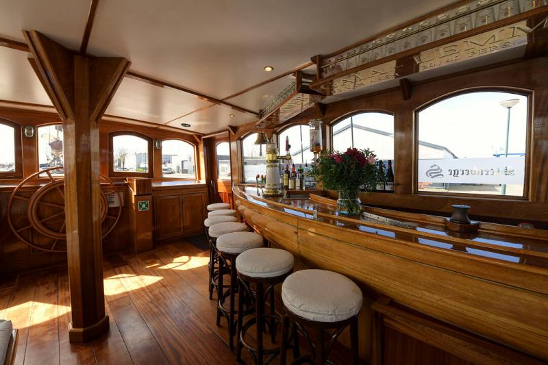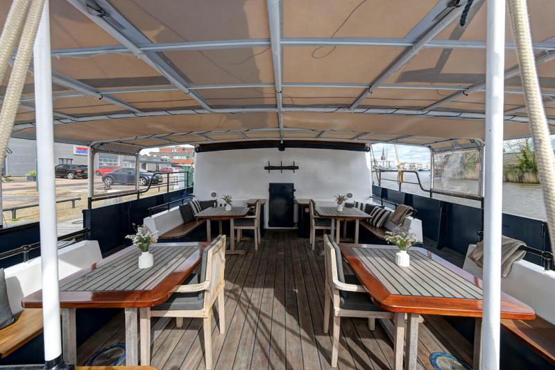 Auf Decksebene befindet sich ein großes Steuerhaus, in dem nicht nur Platz für den Steuerstand ist, sondern auch eine komplette, stilvoll verarbeitete Bar zum gemütlichen Stelldichein einlädt. Dabei haben Sie durch große Fenster rundherum freie Aussicht aufs Wasser. Dasselbe bietet sich Ihnen draußen, auch dort gibt es einen Steuerstand, eine Bar mit Fassbieranschluss und sogar einen Whirlpool. Auf dem Mitteldeck kann man bei schönem Wetter draußen essen. Der große Salon strahlt eine angenehme Atmosphäre aus.