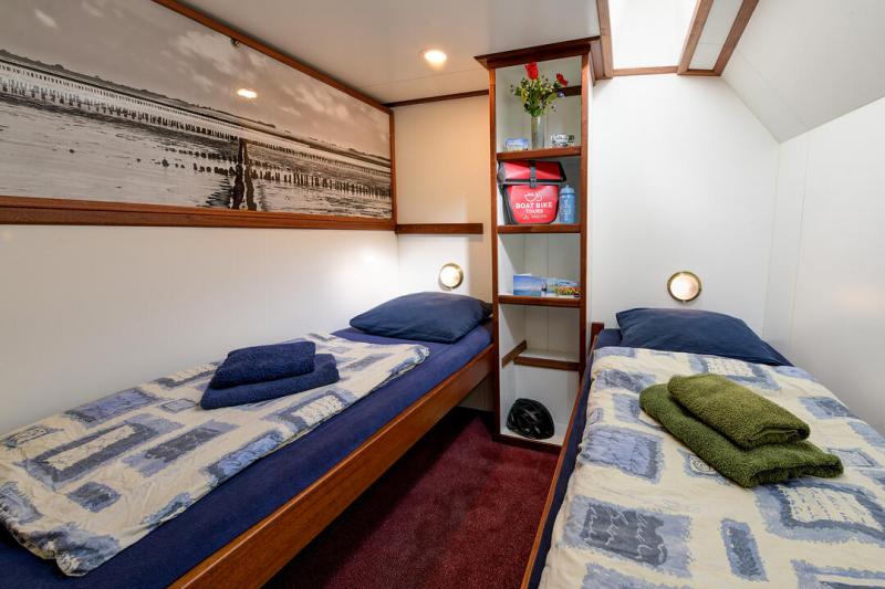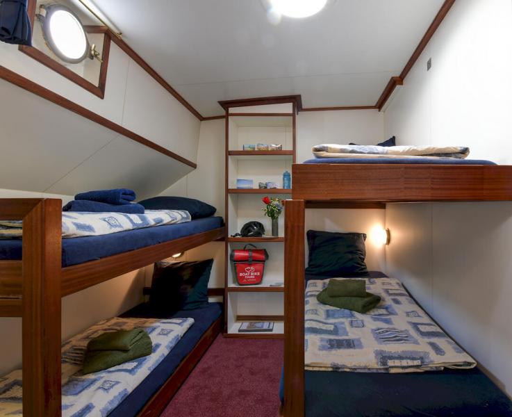 Insgesamt stehen auf dem Schiff 10 Gästekabinen mit 2 Einzelbetten zur Verfügung. Ein Teil der Kabinen kann als 3-Bett oder 4-Bett-Kabine gebucht werden (3. bzw. 4. Bett erhöht). 8 Kabinen befinden sich auf dem Unterdeck, zwei Kabinen auf dem Oberdeck. Alle Kabinen sind ca. 8m² groß (vereinzelt 6m² im vorderen Teil des Schiffes buchbar). In allen Kabinen kann ein Fenster/Bullauge geöffnet werden. 220-V-Steckdose in allen Kabinen.