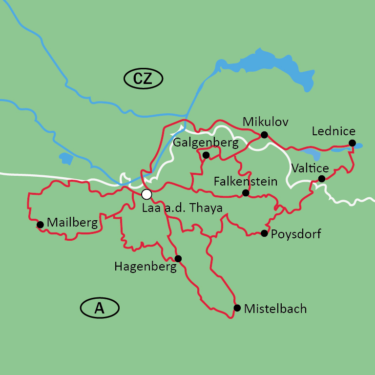 Die große Südmähren Tour (ca. 89 km) verbindet die Highlights des Österreichischen Weinviertels mit dem Tschechischen Südmähren. In Wildendürnbach ist der Besuch des berühmten Galgenberges Pflicht, wo über 185 Weinkeller auf Sie warten. Miklulov liegt entlang der Route mit seinem barocken Schloss und seinen charmanten Altstadt-Gassen. Von Mikulov führt die Tour zu den Včelínek-Seen – ein idyllischer Platz zum Rasten, Baden oder einfach zum Genießen der Ruhe. Nur wenige Kilometer weiter beginnt die märchenhafte Kulturlandschaft von Lednice-Valtice, die zum UNESCO-Weltkulturerbe gehört. Hier warten die prachtvollen Schlösser Lednice und Valtice, verbunden durch weitläufige Alleen, Teiche und Parkanlagen. Zurück in Österreich warten die Burg Liechtenstein und die Burgruine Falkenstein mit einzigartigen Ausblicken auf Sie. Weinreben begleiten Sie zurück nach Laa an der Thaya.
