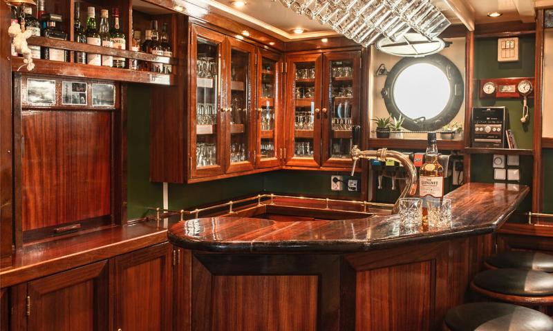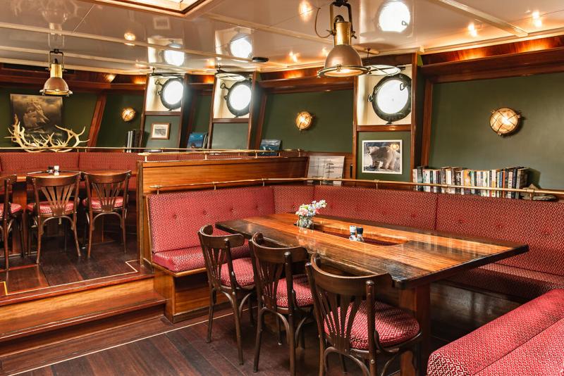 Auf dem Mitteldeck finden Sie den Speise- und Aufenthaltsbereich, gemütlich eingerichtet mit U-förmigen Sofas. Hier finden Sie auch die gut ausgestattete Bar. Draußen gibt es ein großes, möbliertes Deck und wenn das Wetter etwas enttäuschend ist, können Sie auf dem Oberdeck im neuen Decksalon Platz nehmen, wo es bequeme Sitze und eine weite Aussicht nach draußen gibt.